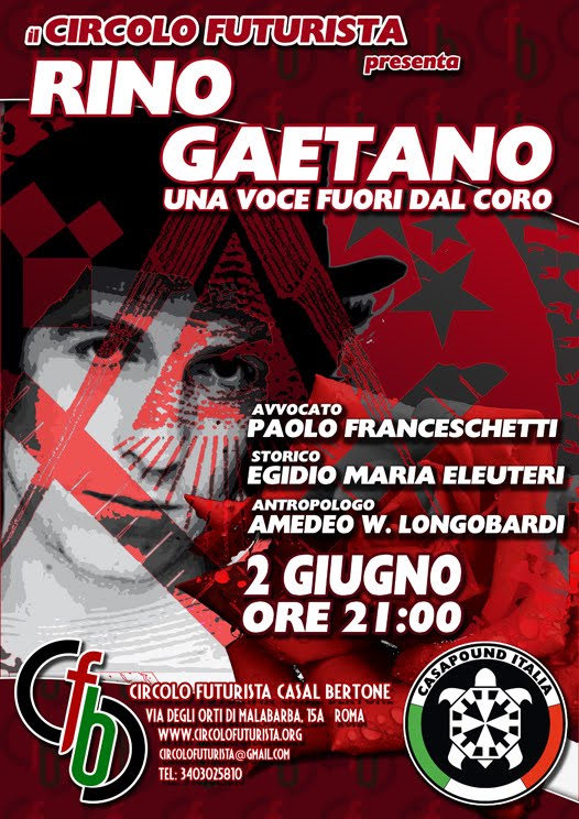 Ricordo poi A TUTTI che questo post è sulla conferenza su Rino Gaetano. Che io sappia, questa è la prima conferenza che parlerà di Rino Gaetano in certi termini. La prima che parlerà dei messaggi in codice nelle sue canzoni e della sua morte. Ce ne fossero, di iniziative così. Non mi pare che qualcuno di voi che criticate il Circolo Futurista abbia avuto un'idea simile.