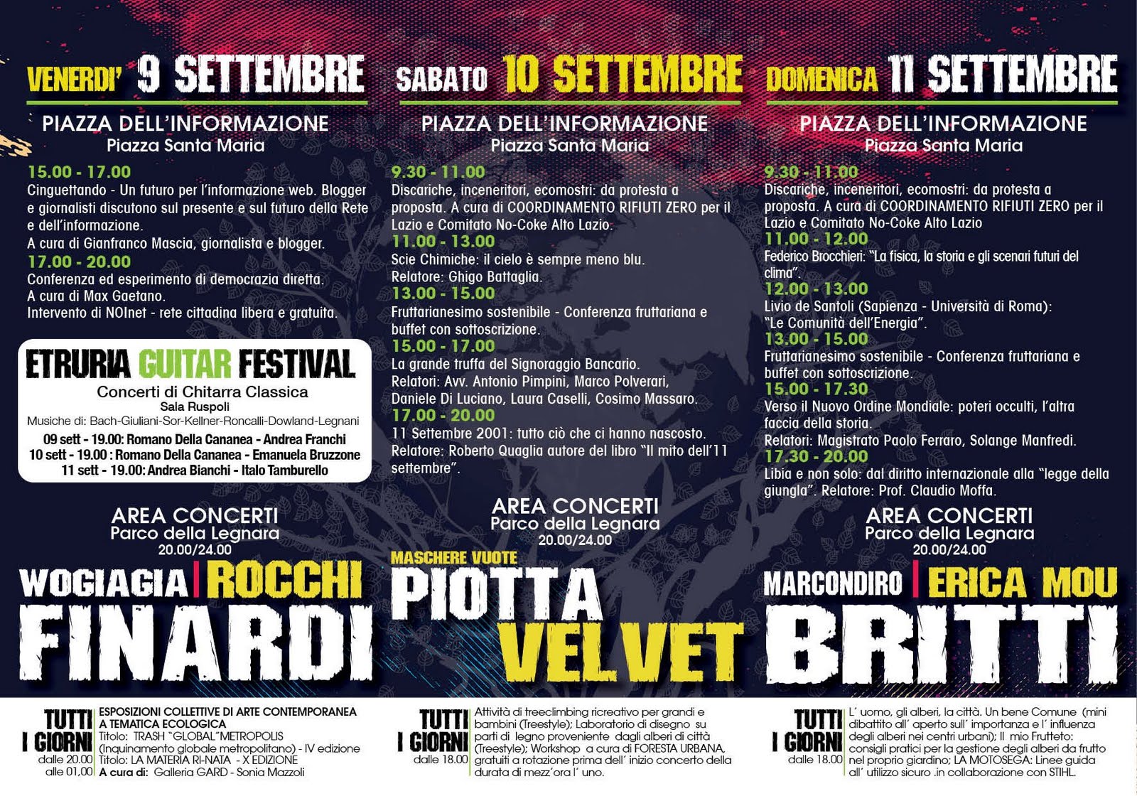all'Etruria Eco Festival le conferenze su signoraggio, scie chimiche e 11 settembre erano zeppe! Ho giosamente notato una maggiore consapevolezza diffusa e ho constatato che Cerveteri è una vera fucina di progetti innovativi che stanno prendendo corpo. Provate a cercare Noinet, Progetto Verdeufficio (Canapa-Cerveteri) ed Emporio Etrusco (www.verdeufficio.eu). Eppoi il vino è fantastico!